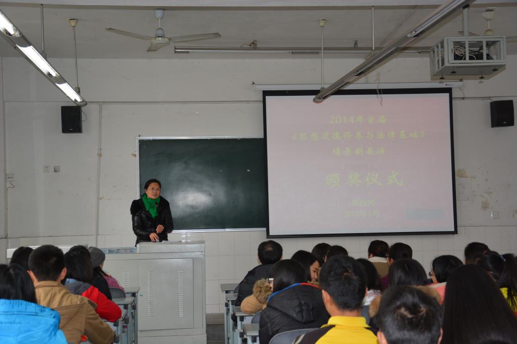 2015年1月6日,思政部在青年路校区B204教室举行了首届《思想道德修养和法律基础》情景剧展演颁奖仪式。思政部主任李霓、副主任洪松林、任课教师和参加展演的33个团队及员工代表共200余参加。颁奖仪式由德育教研室主任雷厉主持,思政部副主任洪松林宣布获奖名单,最后李霓主任发表总结讲话。此次情景剧展演选题丰富,内容积极向上,充分表现了同学们深入学习和践行社会主义核心价值观的风采。首届情景剧展演取得圆满成功,颁奖仪式在同学们热烈的掌声中落下了帷幕。