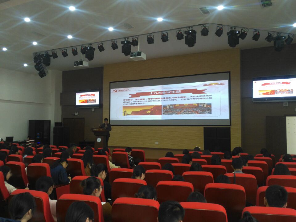 11月7日,思政部委派何衡老师给第四期团校培训班的学员进行党的十九大精神宣讲。为宣讲好十九大精神,何衡老师做了准备充分,反复研读十九大报告等,精心制作了PPT。他从十九大报告主题“不忘初心,牢记使命”入题,现场播放了习近平总书记在上海中共一大会址重温入党誓词视频,分析指出我们党在此诞生,从此出征,由此取得一个又一个的胜利,这是我们党的根脉,这是一次我们共产党人的初心永远不能改变的深情宣告,也是开启了向着伟大梦想进军的新征程的铿锵誓言。 何衡老师遵从报告知识逻辑、理论实践,对大会报告内容逐句逐段进行了深入浅出分析,侧重地强调了十九大报告中的职业教育和工匠精神等与同学们密切关注的问题,宣讲特别注重引导同学们要树立与党和国家一致的核心意识和看齐意识,以通俗的易懂大众化语言获得了良好的宣讲效果,讲座会上同学们聚精会神,边听边做笔记。