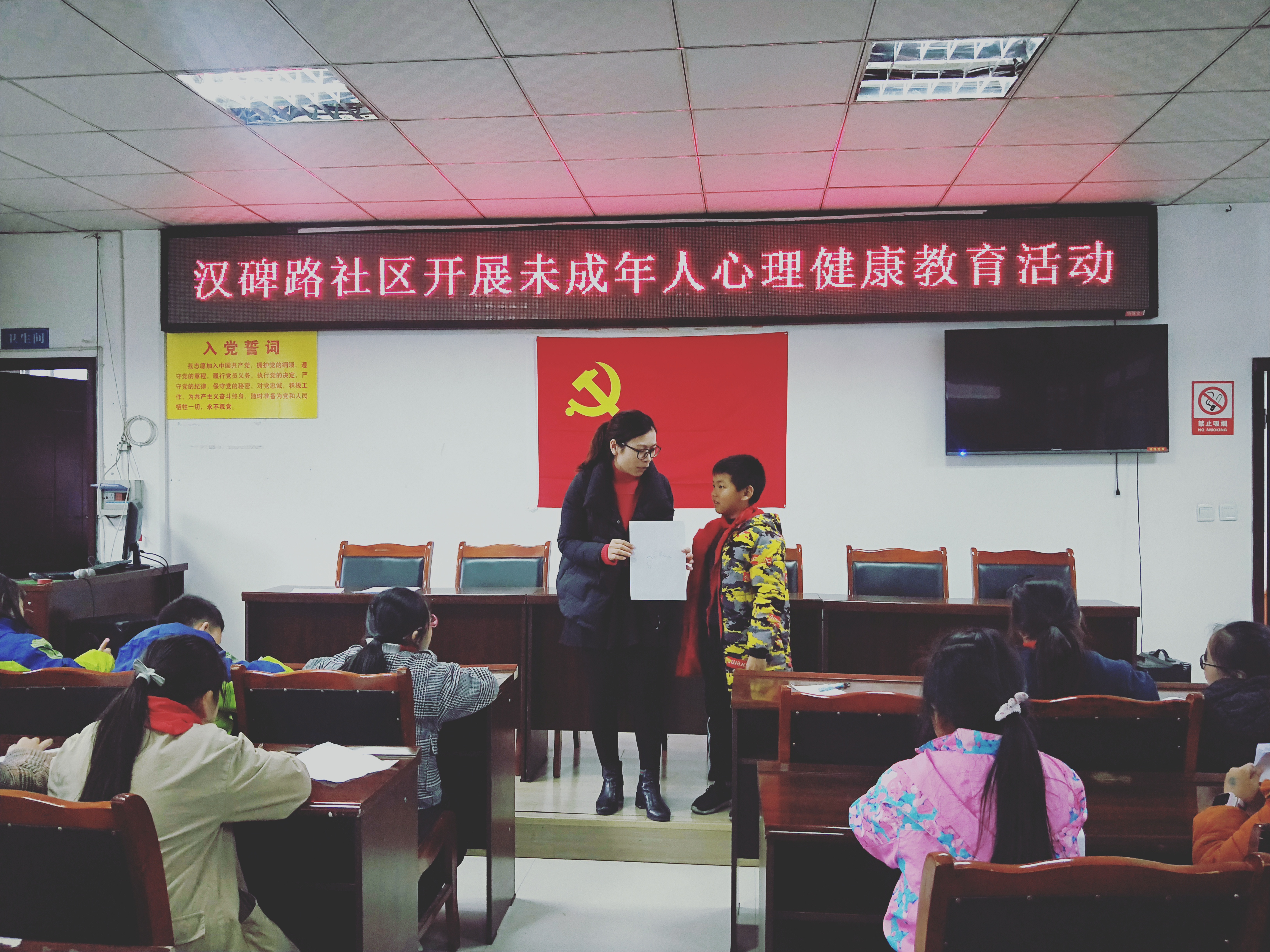 对标雅安市创建文明城市的要求,按照公司“双创”工作的部署,根据未成年人心理成长指导中心工作常态化要求,11月19日,由思政部直属党支部副书记吕登蓉带队,心理健康教育党员教师王丽、党员代表罗春梅一行3人到公司结对的汉碑路社区开展未成年人心理健康教育活动。来至汉碑路社区的20名未成年小朋友参加了此次活动。 心理教育活动在汉碑路社区党员活动室进行。王丽老师与小朋友们互相问好后开始了“跟我说、跟我做”的破冰活动,通过活动活跃了气氛、强化小朋友的团结合作的精神。通过“老鹰捉小鸡”的游戏,评估小朋友们的专注力和协调能力,并给小朋友们提出了改进的建议。通过绘画“我是从哪里来的”,让小朋友们对生命的起源有了自我认知,并唤起大家的感恩意识。整场教育活动气氛热烈,达到了心理健康教育的目标。团体辅导结束后,王丽老师又到社区心理辅导室为部分小朋友开展个体辅导。小朋友们表示非常喜欢参加这样的活动。汉碑社区的负责同志充分肯定了此次教育活动的成效。