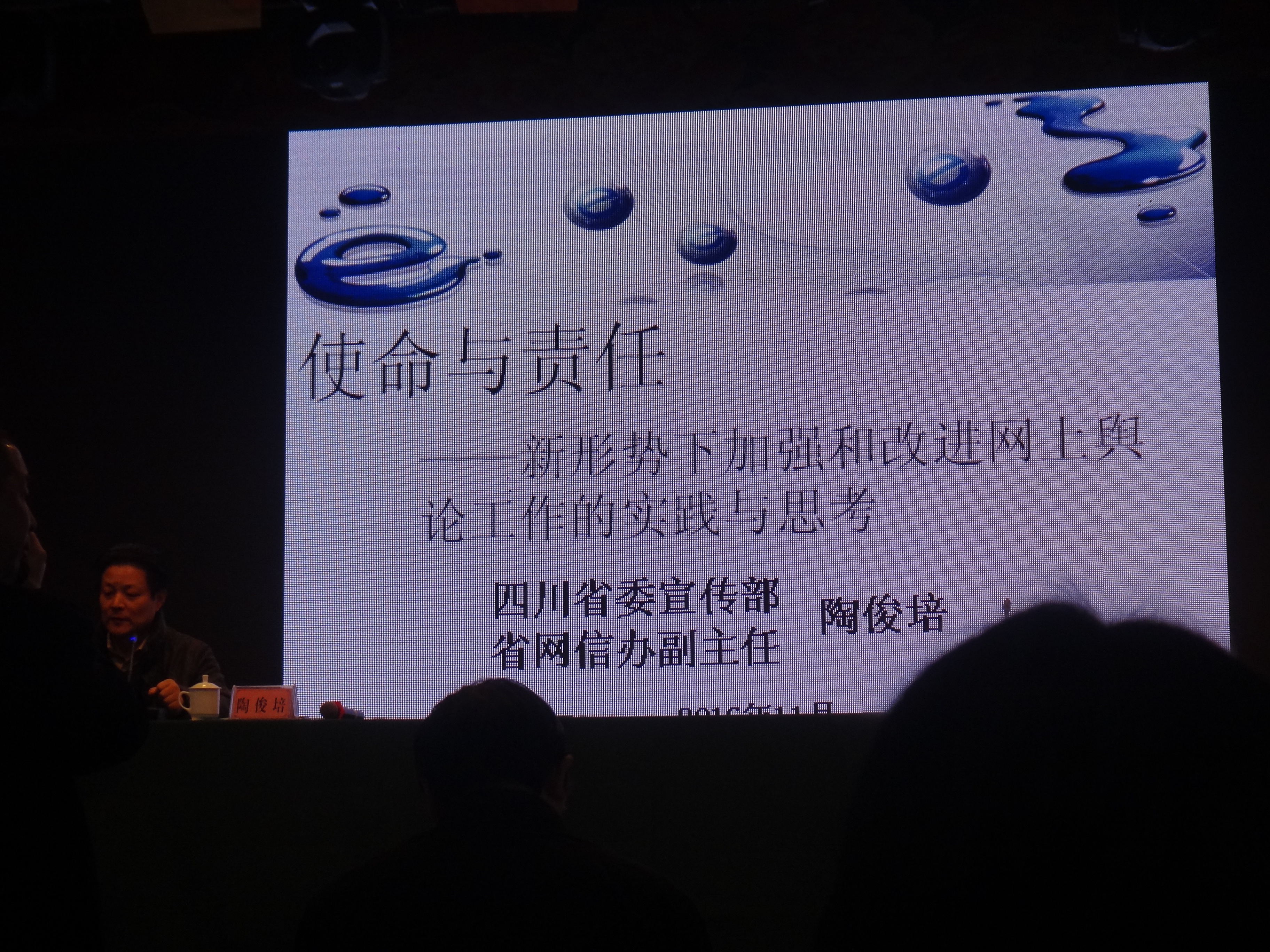 四川省网信办副主任陶俊培作了题为《使命与责任---新形势下加强和改进网上舆论工作的实践与思考》的专题报告。他主要从目标与方向、演化与态势、现状与短板、策略与应对四个方面就如何加强和改进网上舆论工作进行了详细的阐述。进一步指出,需要增强阵地意识,让党的主张成为网络空间最强音;增强导向意识,在凝聚共识上勇于探索;增强忧患意识,在防范风险上未雨绸缪;增强目标意识,建设网络强国,实现伟大中国梦。