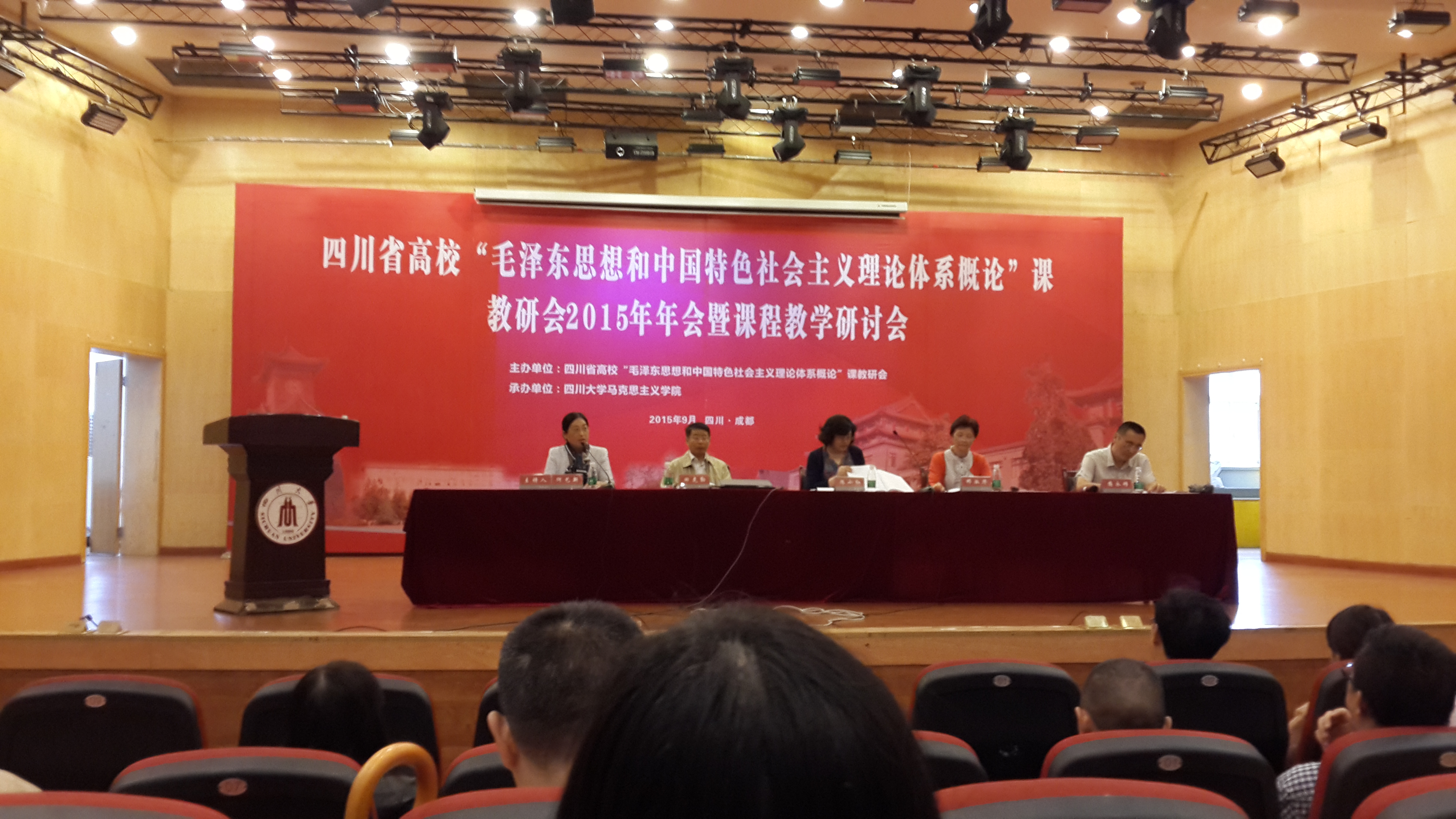 2015年9月18-20日,四川省高校《毛泽东思想和中国特色社会主义理论体系概论》课程(以下简称《概论》)教研会2015年年会暨课程教学研讨会在四川大学举行,教育厅和承担课程的各高校教师代表160多人参加,思政部主任李霓,副主任洪松林,吕登蓉、何衡教师参加研讨会。