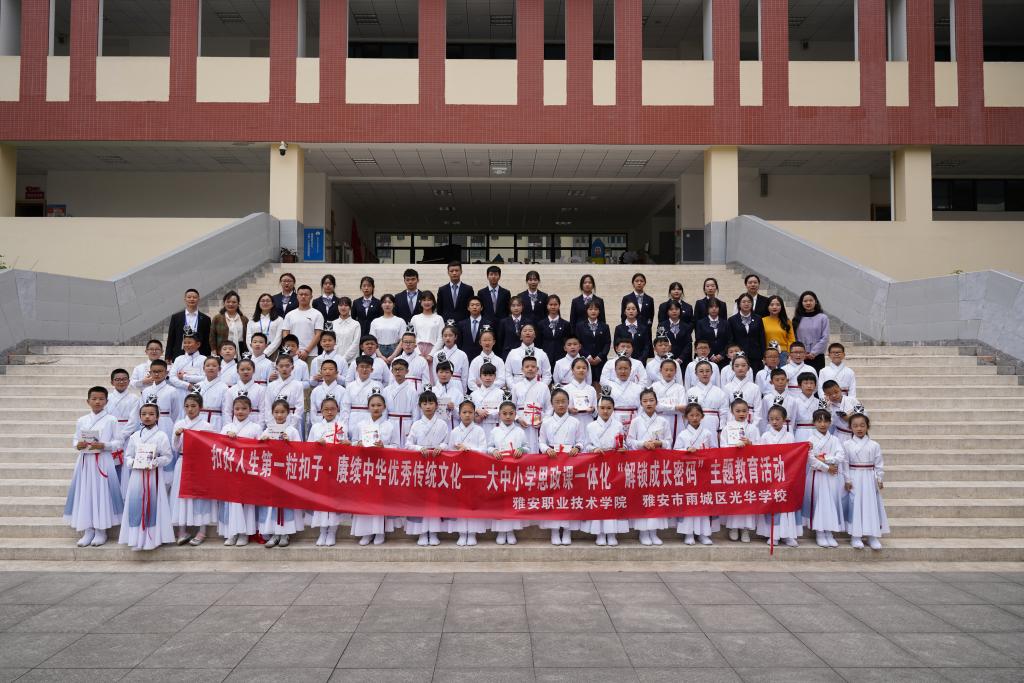 为贯彻落实“立德树人”的根本任务,引导青少年员工“扣好人生第一粒扣子”,迈好人生新台阶。4月26日上午,在公司党委的领导下,太阳成tyc7111cc以“三色铸魂”党建工作品牌为抓手,以公司大中小学思政课一体化研究中心为依托,充分发挥职业院校社区教育的作用,携手雅安市雨城区光华公司组织开展“扣好人生第一粒扣子·赓续中华优秀传统文化——大中小学一体化‘解锁成长密码’”主题教育活动。