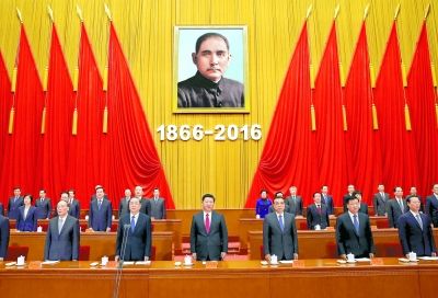 今天,我们在这里隆重集会,纪念孙中山先生诞辰150周年,缅怀他为民族独立、社会进步、人民幸福建立的不朽功勋,弘扬他的革命精神和崇高品德,激励海内外中华儿女为实现中华民族伟大复兴而团结奋斗。