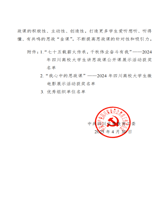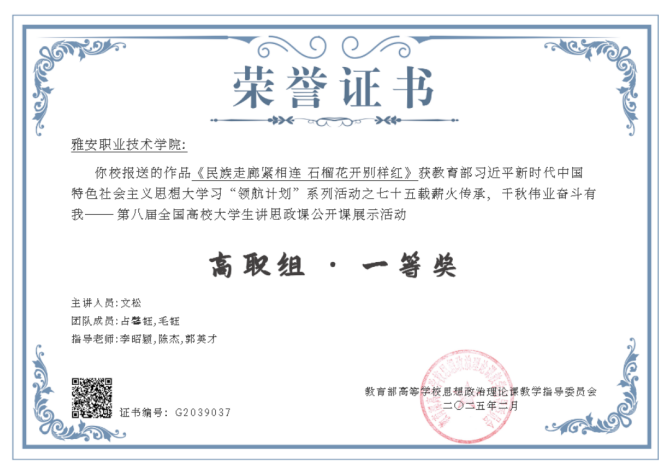 此前,在教育部高校思政课教学指导委员会主办的“七十五载薪火传承,千秋伟业奋斗有我”——第八届全国高校老员工讲思政课公开课展示活动公示的获奖结果中,公司太阳成tyc7111cc李昭颖、陈杰、郭英才三位老师指导的作品《民族走廊紧相连 石榴花开别样红》在来自1339所高校提交的5007部作品中脱颖而出,荣获第八届全国高校老员工讲思政课公开课展示活动一等奖。