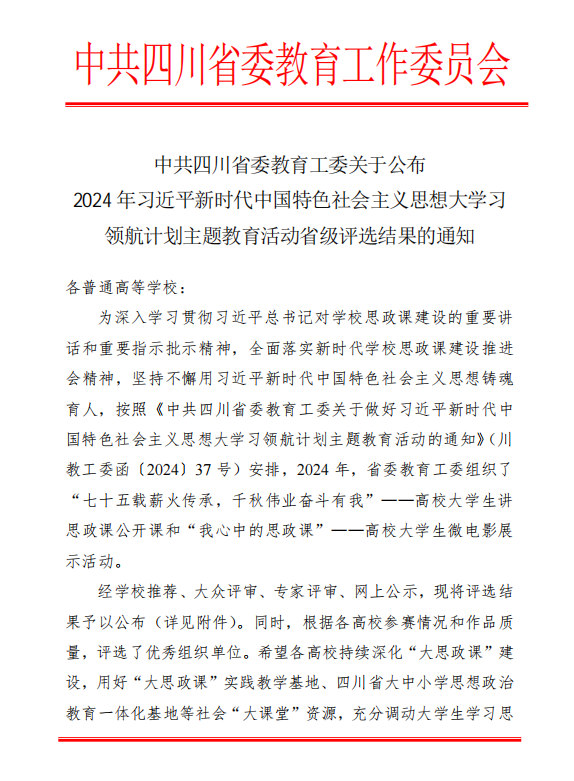 近日,在四川省委教育工委公布的2024年习近平新时代中国特色社会主义思想大学习领航计划主题教育活动省级评选结果中该作品再获省级特等奖。此外,公司廖雨潇、李月夏、任虹静老师指导的作品《以信仰伟力铸雪山忠魂》和胡梦玲、王坤容老师指导的作品《跩响千年花灯传承非遗文化》均获得省级二等奖。